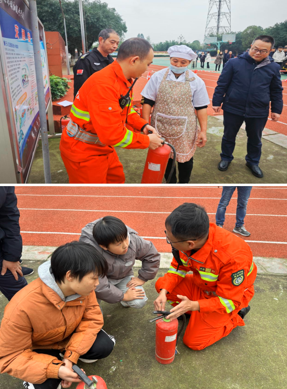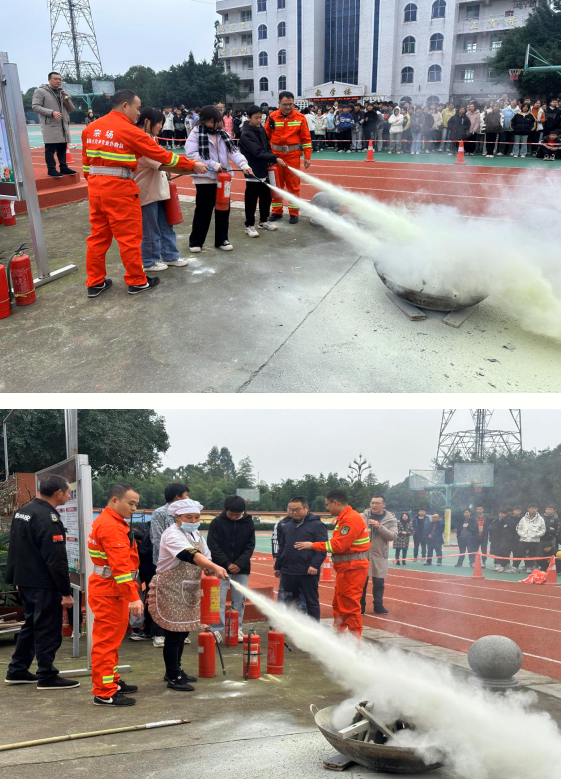 灭火器使用培训:后勤从业人员、安保人员、学生及教师接受了应急救援队专业的灭火器使用培训。教官详细讲解并示范了灭火器的正确使用方法,师生通过实操练习,熟练掌握了扑救初期火灾的技能。