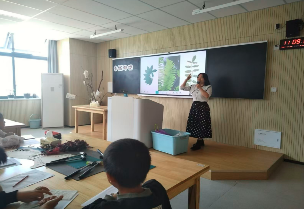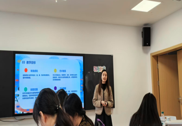美术组魏阳老师说课小学一年级上册《调皮多变的点》,她通过“音乐导入”“艺术欣赏”“感知体验”“示范讲解”“创意实践”“延伸总结” 这六个方面来进行设计,课程逻辑清晰,重难点突出。陈永秋老师执教一年级美术下册《我的家乡味》,通过走进花馍馆,让孩子们了解到花馍具有祝福和吉祥的寓意。接下来便是走进花馍体验馆,孩子们在老师的引导下用“搓、压、捏、切、剪、按、夹”等手法,将一个个制作好的花馍小心地摆放在圆盘里并进行装饰。“小艺术家们”在玩中学,学中练,好不惬意!