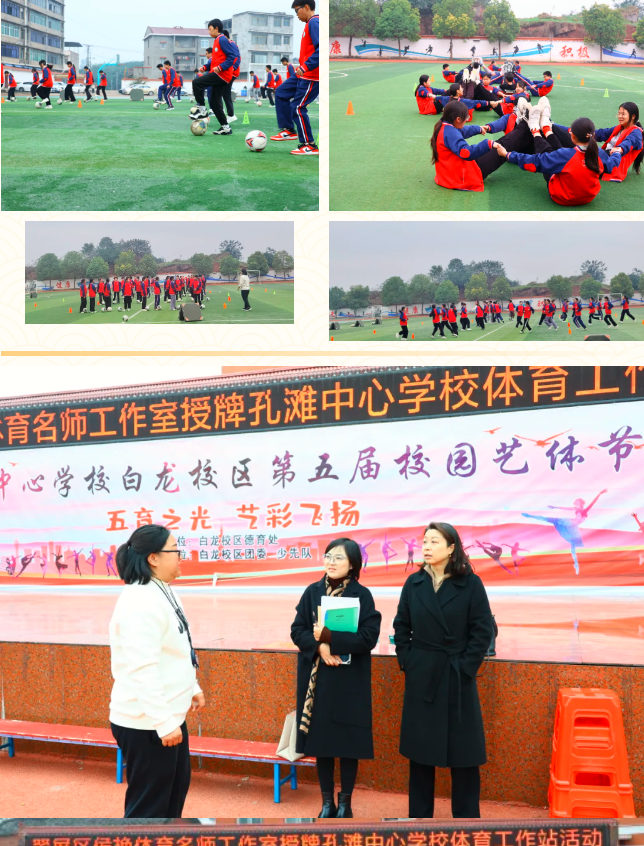 为充分发挥工作室的引领辐射作用缩小城乡差距,进一步扩大教育资源,促进教育公平,充分发挥名师工作室的辐射、示范、引领作用,进而实现“以点带点、结对联动、辐射引领、普惠发展”,推动城乡体育教育教学均衡、优质、和谐发展。2024年11月29日,由四川省教育学会体育与健康专业委员会理事,宜宾市翠屏区侯艳体育名师工作室主持人,翠屏区旧州小学校党支部书记、校长侯艳带队的全体工作室成员一行到白花镇孔滩中心学校白龙校区举行翠屏区侯艳体育名师工作室“孔滩中心学校工作站”建站签约指导暨授牌仪式。侯艳名师工作室全体成员,翠屏区师培中心体育专职教研员胡康君,孔滩中心学校党总支书记祝雪刚,副书记、校长官小智,副校长兼白龙校区执行校长白术才等相关领导,孔滩中心学校各校区专职体育教师及白龙校区部分行政人员共20余人参加了此次活动。该活动由中心学校副校长练剑主持。