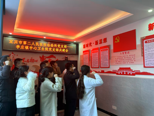 此次党支部共建会,我们在参与质量技术指导学习的同时,也学习党的二十届三中全会精神,积极宣传党的方针政策,树立正确的价值服务观。最后,宜宾市第二人民医院检验科与翠屏区李庄镇中心卫生院党员干部一起高举右手,齐肩握拳,重温入党誓词,铭记庄严承诺,牢记共产党员的政治责任、工作担当和光荣使命,双方携手努力,共同推进宜宾市基层医疗卫生事业蓬勃发展。