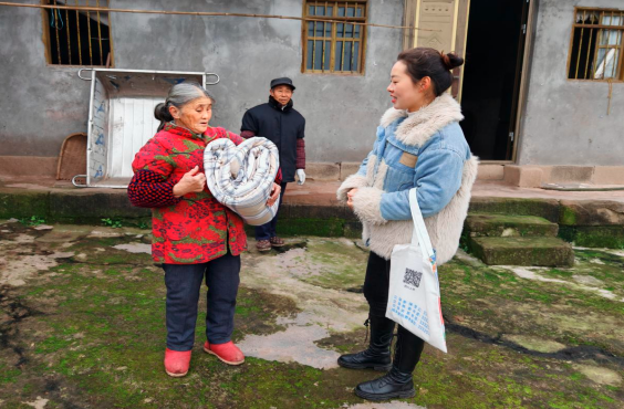 12月10日,刘家镇龙滩村村民罗阿姨从村干部手里接过免费发放的棉衣、棉被,高兴得连声道谢:“真的太感谢了,这棉被又保暖又实用,天冷也不担心了!”