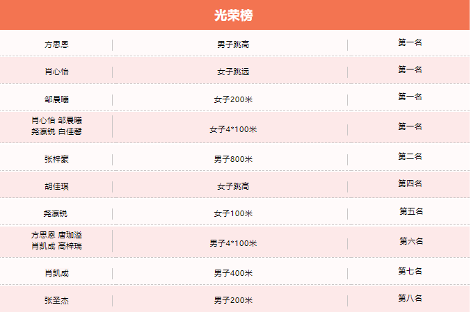 我校的24名运动员在本届运动会取得了优异的成绩,斩获了跳高、跳远等四个项目冠军,以及男子800米的亚军。总积分在全县38支小学代表队中排名第二,荣获本届运动会团体一等奖。