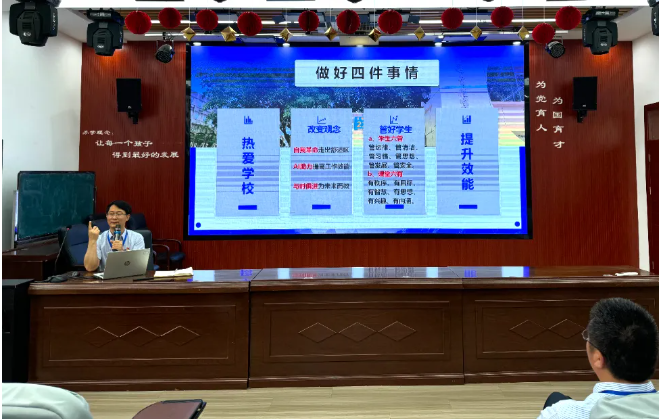 陈兵校长以“埋头巧干练内功 抢抓机遇立潮头”为主题发表讲话。陈校长分析了当前形势,提出了“1134”主张:坚守一个方向,抢抓一个机遇,坚持三个理念,做好四件事情。以此,找准业绩提升着力的关键点,希望全体教职员工下学期在“小组合作”“大课间”“特质学生,深入关怀”等方面再有突破, 让学校更具核心竞争力。