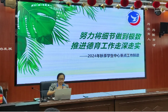 甘德萱校长助理以一个目标、两个服务、三个重点、四个突破、五个场所、六个渠道、七种方法、八步程序明确诠释了学生中心的工作。要坚持特质生关爱行动,温情陪伴、安全兜底,同时进一步落实阳光体育大课间,明确班主任、副班主任的职责,并将清洁卫生常态化管理工作进一步贯彻落实。