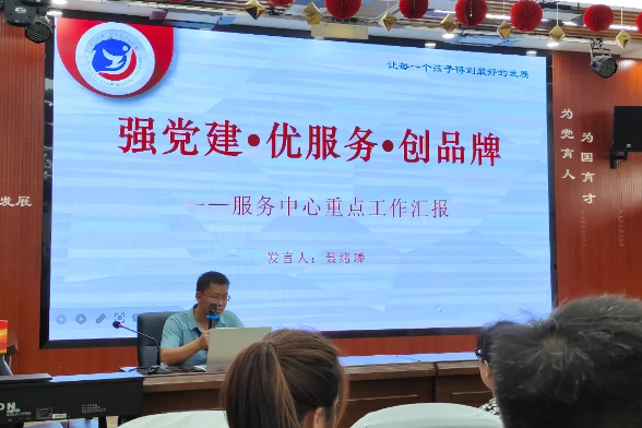 服务中心聂绪臻副书记以“强党建、优服务、创品牌”为主题进行了工作汇报,他提出我们要全面落实新时代党的教育方针,坚持以教师为中心、以学生为中心,靠前服务,用心服务,为高品质办学、高质量发展提供坚实保障。