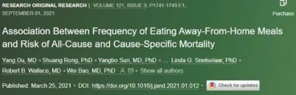 2021年发表在《营养与饮食学会杂志》上的一项研究发现,与几乎不在外就餐的人相比,每天≥2顿在外就餐,全因死亡率增加49%,心血管疾病死亡率增加18%,癌症死亡率增加67%。