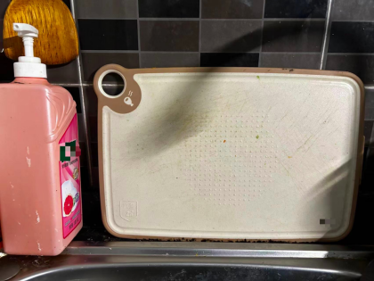 还有人习惯收拾完厨房后,把没干透的菜板平放在厨房台面上。菜板底部都是水——这下好了,霉菌家族都有游泳池了。