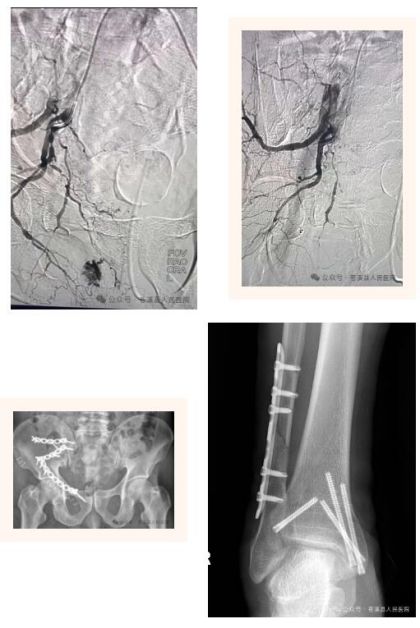 经与家属沟通,介入科团队通过“米粒”大小的创面经股动脉穿刺,进入出血病灶处,进行精准栓塞。术后患者破裂处出血征象消失,血压、心率逐步恢复正常,仅在重症监护室观察一天就转入了骨一科普通病房。经过充分准备后,择期进行了骨盆骨折、右踝骨折手术治疗。 目前,患者的各项指标均恢复正常,病情稳定,正在康复治疗。
