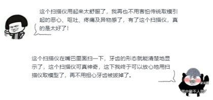 由于扫描头相对较小,避免触及软腭等易引起患者恶心不适等问题的区域,从而也避免了传统托盘取模时引起患者恶心反胃、托盘刺激引起口角炎等临床症状。