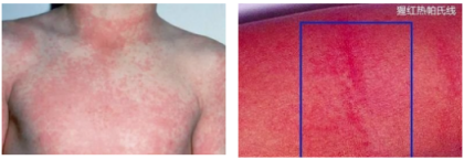 (3)皮疹:发热后24小时内出现皮疹,多数自起病第1~2天出现,偶有迟至第5天出疹。从耳后、颈部及上胸部开始,1日内即蔓延及全身。典型的皮疹为在全身皮肤充血发红的基础上散布着针帽大小,密集而均匀的点状充血性红疹,手压全部消退,去压后复现。偶呈“鸡皮样”丘疹,中毒重者可有出血疹,患者常感瘙痒。在皮肤皱褶处如腋窝、肘窝、腹股沟部可见皮疹密集呈线状,称为“帕氏线”。