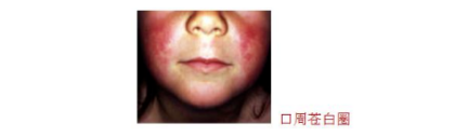 (4)口周苍白圈:面部充血潮红,可有少量点状皮疹,口鼻周围相形之下显得苍白,称“口周苍白圈”。