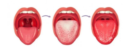 (5)草莓舌和杨梅舌:病初起时,舌被白苔、乳头红肿、突出于白苔之上,以舌尖及边缘处为显著,称为“草莓舌”。2~3天后白苔开始脱落,舌面光滑呈肉红色,并可有浅表破裂,乳头仍突起,称为“杨莓舌”。