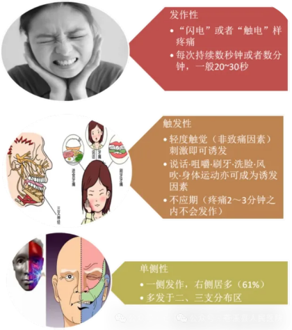 该病的特点是头面部三叉神经分布区内突发、骤停、反复发作如闪电般、刀割烧灼样难以忍受的剧烈疼痛。病因多为三叉神经出入脑干的部位,我们称为根区,有血管压迫,造成神经、脑干发生病理改变,异常放电所致。患者痛苦不堪,因此有人形容为“天下第一痛”,如果长期得不到有效治疗,患者痛不欲生。