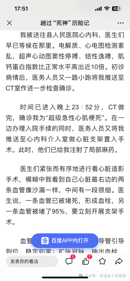 7月8日,当患者彭必辉将自己写的文章——《趟过“死神”历险记》发给苍溪县人民医院的时候,全院医护人员无比动容,他们没想到平凡普通的本职工作,能让患者如此感同身受。