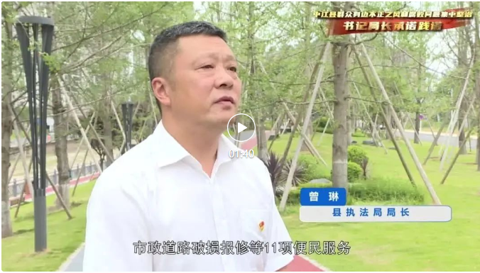我是县执法局局长曾琳,当前全县正在开展“群众身边不正之风和腐败问题”集中整治行动。为增强城市管理水平,提升群众满意度,我代表综合行政执法局向全县人民作出三项承诺,请人民群众监督。