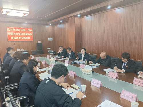 2023年4月12日,遂宁市2023年第一季度劳动人事争议仲裁办案质量评查专题会在蓬溪召开。本次会议旨在总结全市2022年以来劳动人事争议调解仲裁工作成效,实事求是分析当前劳动关系形势,部署当前及今后一个时期重点工作;通过案件评查,切实提升劳动人事争议调解仲裁工作规范化、标准化、专业化水平。市劳动人事争议仲裁院和各县(市、区)劳动人事争议仲裁院负责人、办案骨干人员参加了本次会议。