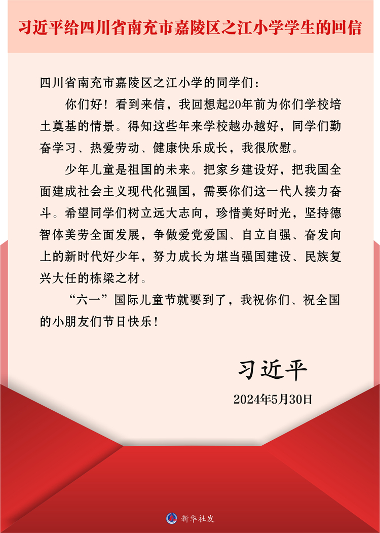 习近平回信勉励四川省南充市嘉陵区之江小学学生 坚持德智体美劳全面发展 争做爱党爱国自立自强奋发向上的新时代好少年 祝全国小朋友们“六一”国际儿童节快乐
