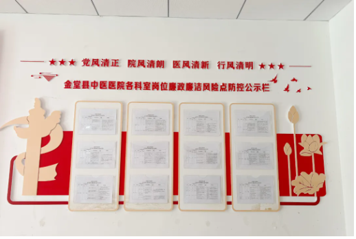 为进一步推进清廉医院建设,进一步加强党员干部职工的政治思想教育,营造风清气正、廉洁高效的医院廉政文化氛围。金堂县中医医院深入挖掘中医廉洁文化内涵、环境资源,将文化墙设计与医院“四风”建设融为一体,依托群众聚集区域、公共活动场所、党群活动阵地专栏,采用图文并茂的形式,形象化、视觉化地营造崇廉拒腐、尚俭戒奢的浓厚文化氛围,充分展示了医患和谐、求真务实、团结奋斗、崇廉尚廉的医院新风貌。