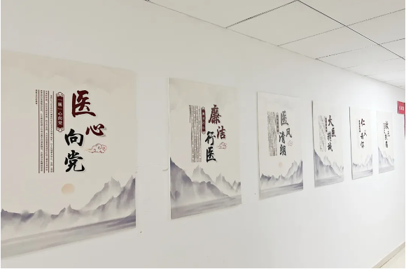 行政楼四楼文化廊道以传统黑白水墨画为底色,将预防“白袍点墨”、坚持“知黑守白”等理念融贯于文化展示之中,教育引导全院干部职工自觉遵守医者道德规范,履职尽责、廉洁从业。