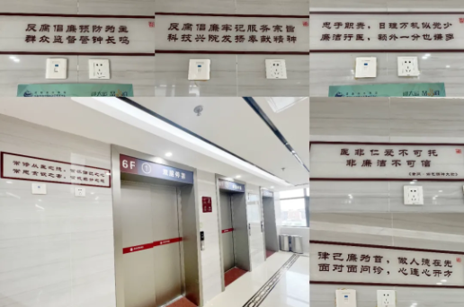 住院部电梯厅张贴廉洁文化语录,通过“正行风、树廉风、传家风”植廉于心、倡廉于行,弘扬行业优良作风,构筑廉洁文化矩阵,以“九项准则”促党风廉政,助力清廉医院建设。