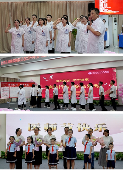 会上,新入职医师在李学炯带领下重温医师誓言,承诺以行动践行医者的责任和担当;全体参会人员在廉洁行医签名墙上集体签名;在退休医师、服务对象等的祝福声中,6名“医二代”孩子代表佩戴鲜艳的红领巾,手捧鲜花,来到现场向爸爸妈妈表达他们的爱与敬仰。会议还对评选出的优秀医师和优秀科室进行了表彰,新生儿科副科长唐桂梅代表全体获奖人员发言。最后,来自各临床医技科室的医务人员还表演了精彩纷呈的文艺节目。
