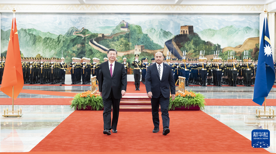 3月25日下午,国家主席习近平在北京人民大会堂同来华进行国事访问的瑙鲁总统阿迪昂举行会谈。这是会谈前,习近平在人民大会堂北大厅为阿迪昂举行欢迎仪式。新华社记者 申宏 摄