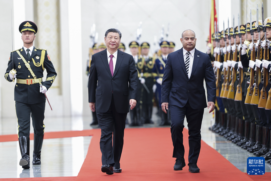 3月25日下午,国家主席习近平在北京人民大会堂同来华进行国事访问的瑙鲁总统阿迪昂举行会谈。这是会谈前,习近平在人民大会堂北大厅为阿迪昂举行欢迎仪式。新华社记者 翟健岚 摄