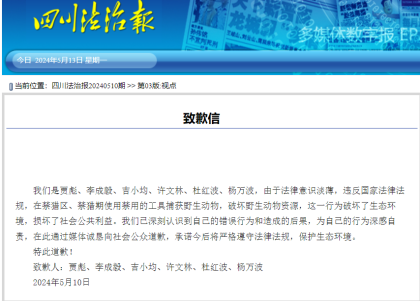 5月10日,被告人贾某、李某某、吉某某、许某某、杜某某、杨某某亲手写下的“公开致歉信”在四川法治报刊登,对自己非法猎捕野生动物的违法行为公开道歉,并希望群众引以为戒。