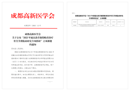 近日,成都高新医学会公布了“2023年氟比洛芬凝胶贴膏治疗骨关节炎临床研究专项科研”的立项结果。经专家评审、成都高新医学会审批,西充县人民医院康复科刘娟同志申报的《口服NSAIDs联合氟比洛芬凝胶贴膏治疗膝骨关节炎患者的有效性及安全性临床研究》课题成功获批立项,获得经费3万元。