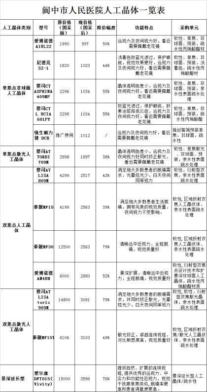 根据国家医保局的要求,国家组织的第四批高值医用耗材人工晶体类集中带量采购已成功实施,平均降价60%,并于今年6月在全国范围内执行。功能性人工晶体的价格变得更加亲民。阆中市人民医院积极响应国家医改政策,所有人工晶体均采用国家医保带量集采品种,包括单焦点、多焦点、三焦点、散光型等10余个品种,为患者提供了多样化的产品选择,满足了不同白内障患者的术后视觉需求。