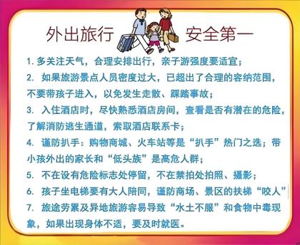 (一)假期外出活动增多,出行需注意交通安全。外出时请家长和孩子自觉遵守交通规则,过马路遵守信号灯,走斑马线、人行天桥、地下通道,严禁跨越交通护栏;外出乘车坐有资质,车况好的营运车辆,严禁乘坐黑车、摩的、农用车和超员车辆等,乘车时系好安全带,。