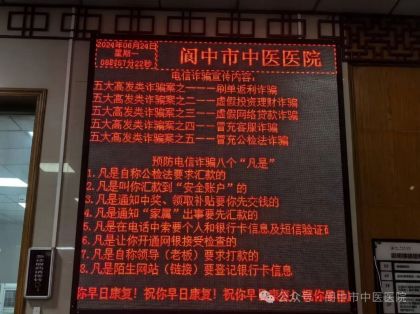 阆中市中医医院将继续深化反诈宣传工作,持续利用微信群、宣传栏、LED显示屏、微信公众号、视频号、抖音号等多种渠道,构建长效宣传机制,不断巩固反诈成果,让诈骗分子无处遁形,共同守护好人民群众的“钱袋子”,为创建平安医院、维护社会稳定贡献力量。