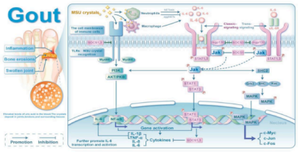 文章指出:IL-6的过度合成和IL-6R信号通路的失调与各种炎症和风湿性疾病有关,并与痛风的发病机制密切相关,因此对痛风的诊断和治疗具有重要意义。IL-6及其受体,连同他们介导的信号通路,参与广泛的生物事件,包括免疫反应、急性期反应、急性和慢性炎症反应、痛风肾脏的病理生理学、尿酸排泄、滑膜炎症、关节破坏、骨侵蚀、心血管事件等。该文阐明了IL-6及其受体表达的调控机制、IL-6及其受体功能的分子机制,以及IL-6及其受体信号通路在痛风发病机制中可能作用,为了解痛风的分子机制和开发新的治疗方案提供重要的见解,为临床实验或研究奠定基础,并为临床药物治疗提供新的选择。