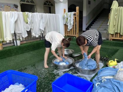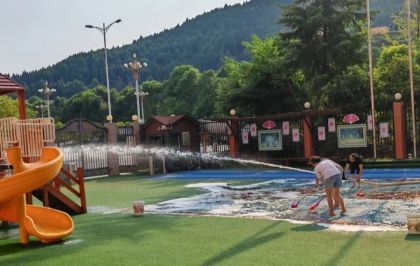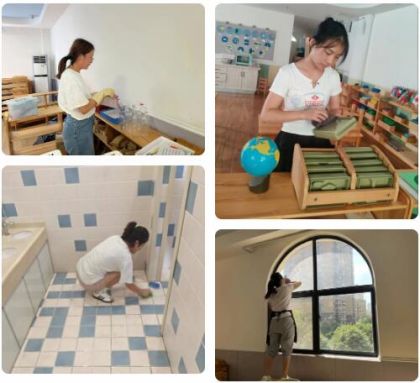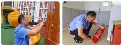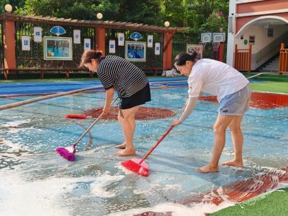 烈日下,后勤人员挥洒着汗水,在户外公区认真打扫、清洗大型玩具、进行安全隐患排查,只为给小青葵们创设一个干净舒适、安全的环境。