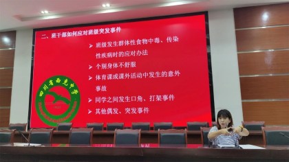 为发挥学生干部的榜样力量,营造平安和谐的校园环境。9月23日晚,我校在学术厅召开学生安全培训大会。学校文志勇副校长、安保处主任何文霄、安保处副主任余兴国和庞田丽、嘉陵物业刘兵教官及部分学生干部参加会议。会议由安保处副主任庞田丽老师主持。