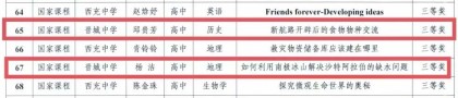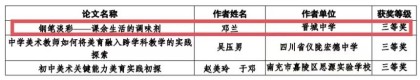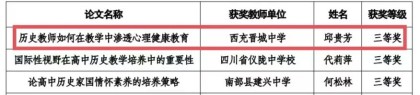 2024年南充市高中历史论文评选活动中我校教师邱贵芳老师的《历史教师如何在教学中渗透心理健康教育》荣获三等奖。2024年美育教育教学论文评选活动中邓兰老师的作品《钢笔淡彩—课余生活的调味剂》荣获三等奖。