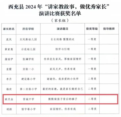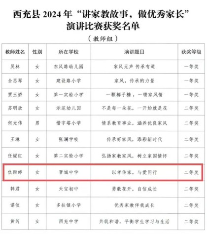 为深入学习贯彻习近平总书记关于“注重家庭、注重家风、注重家教”的一系列重要论述,推动全县中小学、幼儿教师和家长积极主动学习家庭教育知识,提高家校共育能力和水平,根据市关工委、市教体局、市妇联文件精神,西充县教体局、县关工委和县妇联联合举办“讲家教故事,做优秀家长”演讲比赛。晋城中学获得县先进集体奖、仇雨婷老师获县演讲比赛教师组二等奖、高三9班学生家长欧代金女士获县演讲比赛家长组二等奖。