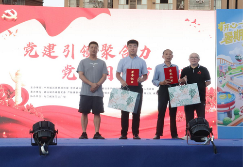 7月1日傍晚,威远县城西商圈开展“党建引领聚合力 党群同心万业兴”主题活动,通过文艺表演、公益服务、先进颁奖和商业惠民活动等,庆贺中国共产党成立103周年,发挥党建引领作用,推动商圈企业、党组织团结共进。