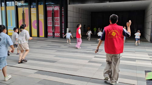 到了孩子们最喜欢的游戏环节,志愿者组织大家来到广场空旷区域,进行“123木头人”游戏,通过游戏运动锻炼小朋友的灵活性、促进孩子们社交与团结互助。志愿者离小朋友五米远背对着小朋友们念儿歌《123,木头人》,孩子们快速奔跑起来......