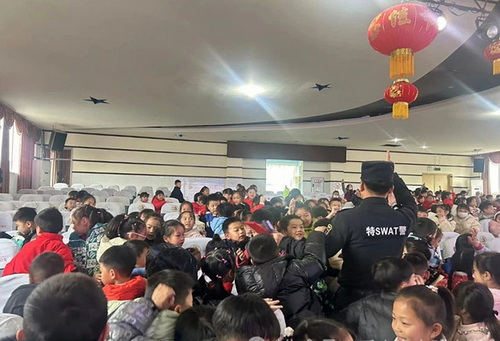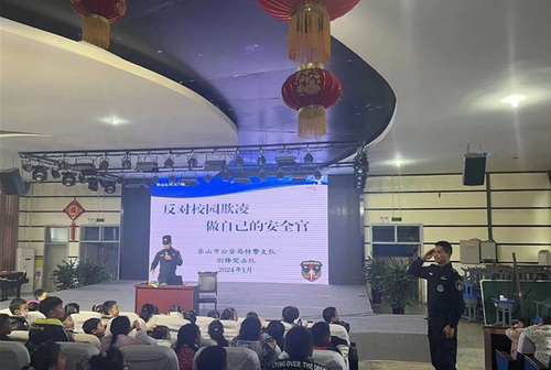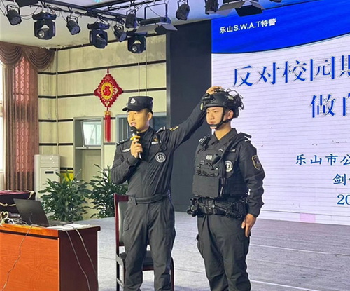 为未成年人筑牢防欺凌的保护墙,需要全社会的共同努力。2024年1月5日,我校特邀请乐山市公安局特警支队剑锋突击队的警察叔叔们,在幸福实小大讲堂为一年级的孩子们带来了《反对校园欺凌,做自己的安全官》的专题讲座。活动伊始,任伟警官为孩子们讲解演示了头盔、手枪、手铐等装备的用途。和武器装备近距离接触,同学们进一步增强了安全意识,对警察叔叔的崇敬之情油然而生。