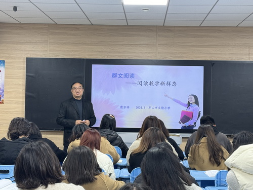 展评课后,为提升我校青年教师的专业素养,增加专业知识,培养专业能力,教育教学专家殷宗祥老师走上讲台,为老师们开展了一场精彩纷呈的群文阅读专题讲座。讲座从群文阅读的内涵、意义、现状、实施方法等方面展开,着重引导老师们在群文阅读教学的过程中培养学生的四项关键能力。