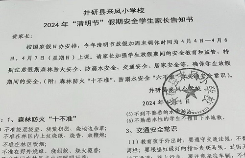 向各位家长告知2024年清明节放假安全事宜,期望得到家长的积极配合,履行监管职责,确保孩子假期在家安全、健康、快乐成长。通过“小手牵大手”活动,让家校携手,用文明祭奠的实际行动,成为告别陋习的先行者、文明祭祀的带头人,携手共建文明和谐的美丽井研。