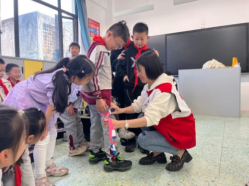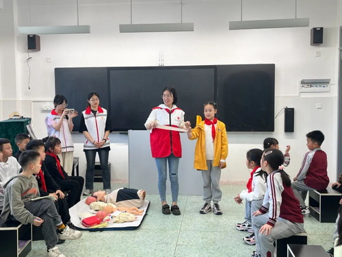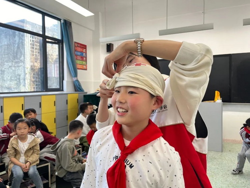 黄医生生动讲解的同时,她的团队老师们就在一旁形象地演示。这激起了同学们实践操作的浓厚兴趣,大家有的配合扮演“伤员”,有的认真地进行止血包扎,有的用力地做着胸外按压,有的向老师提出疑问……小小年纪的同学们俨然成了救死扶伤的医者,教室俨然成了热火朝天的应急救护现场。