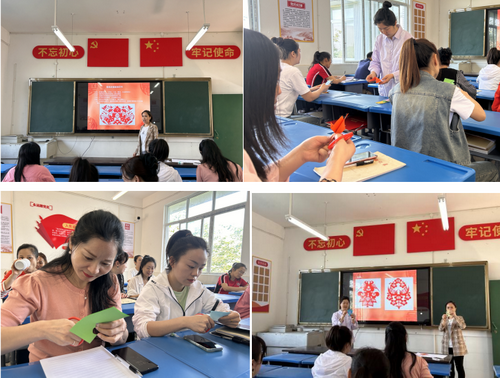 本次培训由何润萍与陈绿梅两位教师主讲,先是讲述了剪纸的概念、材料以及基本纹样。接着由一人讲述剪纸的措施和环节分为:折、画、剪、展、贴,再由一人负责现场指导。最后老师们在愉快的氛围中完成了自己的剪纸作品并纷纷展示。