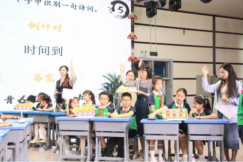 少年是一种精神,一种风采,更是一种情怀,一种境界。26支战队纷纷介绍自己的队伍,豪言壮语间,战斗的号角悄然奏响,渴望胜利的小勇士们早已枕戈待旦。 在主持人宣布比赛规则后,各个战队摩拳擦掌,跃跃欲试,准备大显身手。第一轮 ,必答题。大鹏一日同风起,扶摇直上九万里。经过激烈角逐,各战队渐入佳境;第二轮,眼疾手快。有匪君子,如切如磋,如琢如磨。各战队的队员齐心协力,集思广益,在紧张的两轮赛事过后,只剩7个战队继续角逐;第三轮 ,点字成诗。"笔落惊风雨,诗成泣鬼神",这是纵横笔墨的浩荡神韵。点字成诗,不仅检测选手对古诗词的积累,更考验选手们的细心程度;第四轮 ,超级飞花令。面对不同令字,各位参赛选手开始飞快地思索,纷纷拿出看家本领,一句句诗词脱口而出。