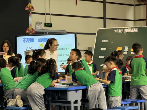 陈琳老师执教《克和千克》。陈老师设置游戏“掰手腕”比谁的力气大,激起学生学习兴趣,引入新知学习。课堂以小组合作形式学习,借助日常生活情境,以使用称、少用称、不用称的工具体验为思维支架,以1克—100克—1000克(1千克)的真实体验为学习支架,经历称一称、掂一掂、比一比、看一看、估一估的活动,使学生初步形成质量的概念,学会借助参照标准来估量,建立1克和1千克的观念,在丰富的活动中,培养学生估量物品质量的意识,发展学生的量感。