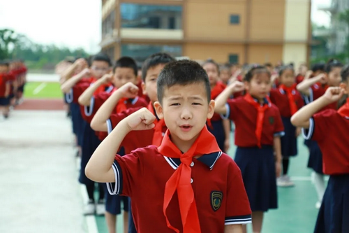 伴随着激昂的出旗曲,护旗手护卫着鲜艳的队旗,迈着铿锵的步伐入场。全场少先队员齐唱《中国少年先锋队队歌》,嘹亮的歌声在校园上空回荡,彰显着少先队员们的朝气与信念。