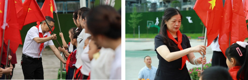 接下来,学校为十六个新中队授予中队旗,并为新辅导员佩戴红领巾、颁发聘书。