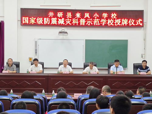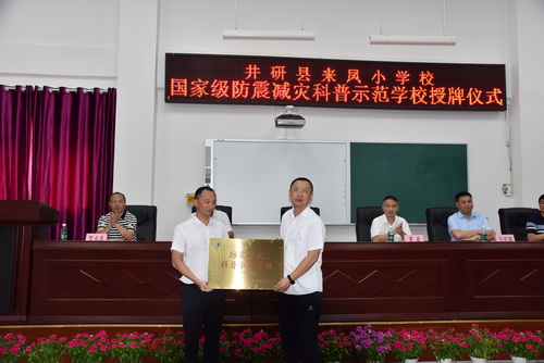 四川省地震局公共服务处处长孙玮向井研县来凤小学校授牌并讲话,他指出:示范学校的成功创建对于提升学校师生防震科学素养只是走出了第一步,要以创建“防震减灾科普示范学校”为契机,进一步强化防震减灾宣传力度,持续为公众普及地震应急避险、逃生自救等知识,不断提升公众地震灾害避险能力。